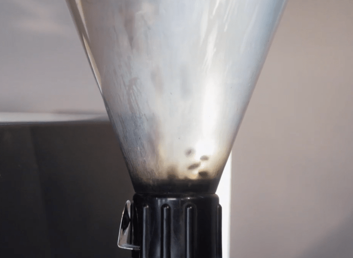 Asa arata recipientul in care sunt introduse boabele de cafea “ca la cafenelele tari”. Problema e ca acele cafenele nu folosesc boabe de calitatea celor aratate cateva cadre mai tarziu, iar baristii ce lucreaza in acele locuri, nu ar lasa niciodata acel recipient sa ajunga atat de murdar si degradat. Este parte a echipamentului ce se curata zilnic, usor de spalat si de tinut intr-o stare perfecta. Doar uitarea unor boabe mult prea prajite, uleioase si rancede, pe o perioada lunga de timp, impreuna cu un spalat rar, cu agenti puternici pentru a scoate jegul, aduc o bucata de plastic in starea din film.